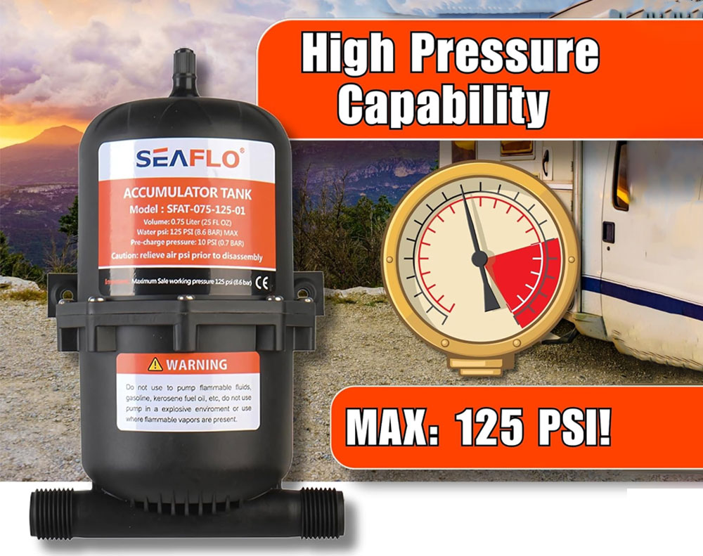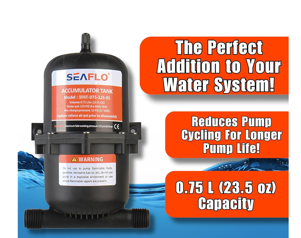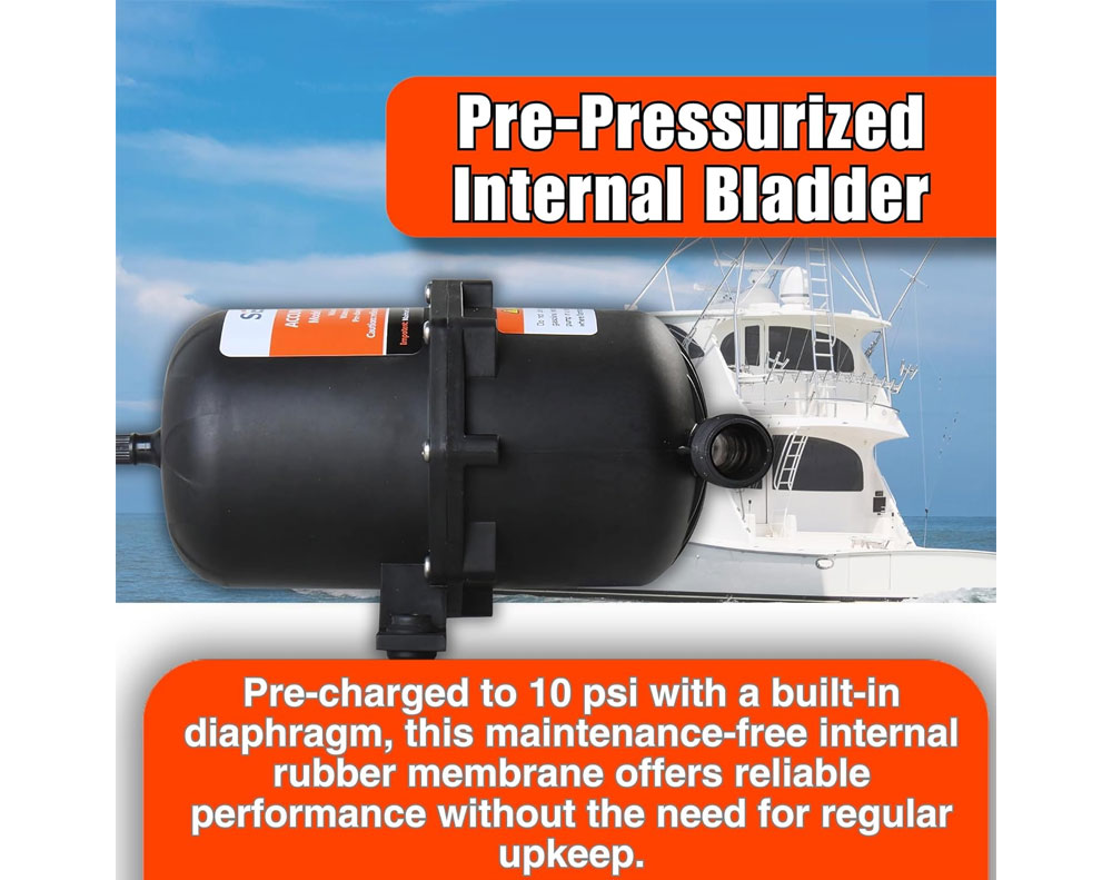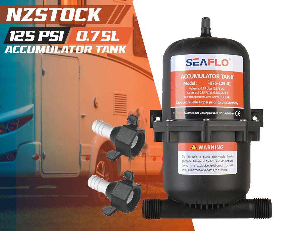 The 0.75L water accumulator tank smooths water flow and reduces pump cycling by absorbing pressure fluctuations. Designed for marine, RV, and caravan systems, it improves pump efficiency, lowers noise, and extends pump life with reliable pressurized performance