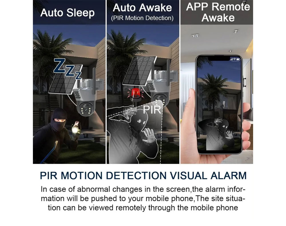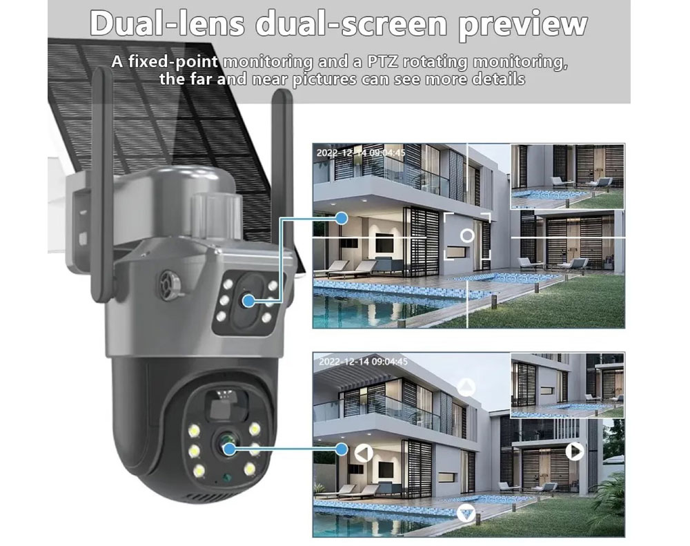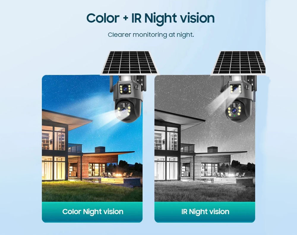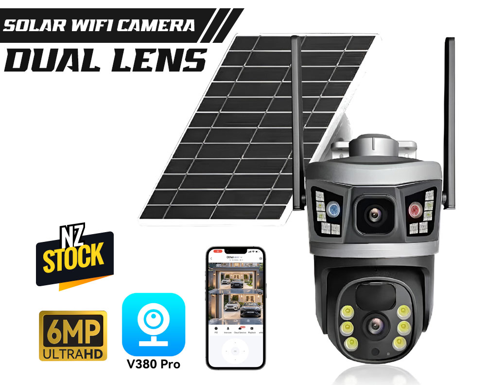 Upgrade your security with this 6MP Dual Lens Solar WiFi Camera provides 365-day continuous surveillance. Features include PTZ (Pan & Tilt) control, PIR+AI humanoid detection, two-way audio with AI noise reduction, and two night vision modes (IR and color). Easily control and monitor remotely via the V380pro app.