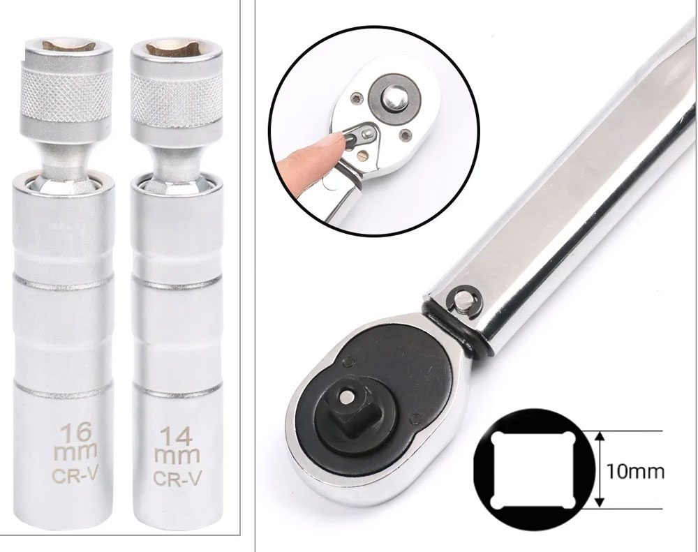 4Pcs Magnetic Spark Plug Socket Set: 3/8inch Drive Torque Wrench (5-60Nm Range), 14mm/16mm Ultra-Thin Sockets, 10inch Extension Rod, Crafted from Chrome Vanadium Steel