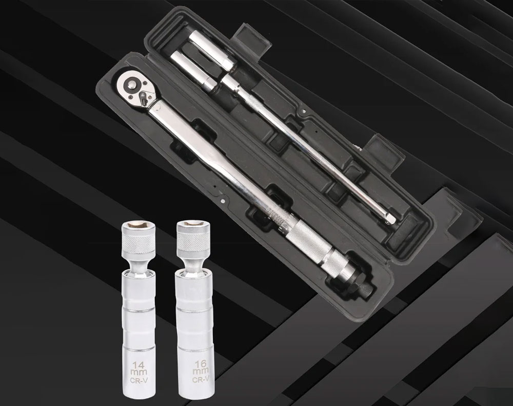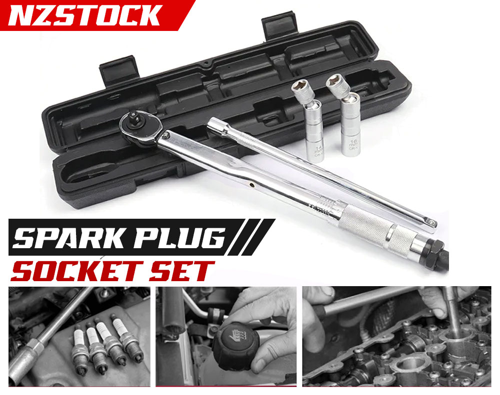 Enhance your automotive tasks with this versatile 4Pcs Spark Plug Socket Set. It features a fully adjustable torque wrench with a ratchet head, providing precise tension settings within a 5-60Nm range. The included 14mm and 16mm sockets are ultra-thin (only 1mm thickness) and contain a built-in magnetic ring for secure, easy plug removal. Crafted from durable Chrome Vanadium Steel with a full-polish chrome finish, this set is resistant to rust and corrosion. Includes a 10inch extension rod and a sturdy plastic storage case.