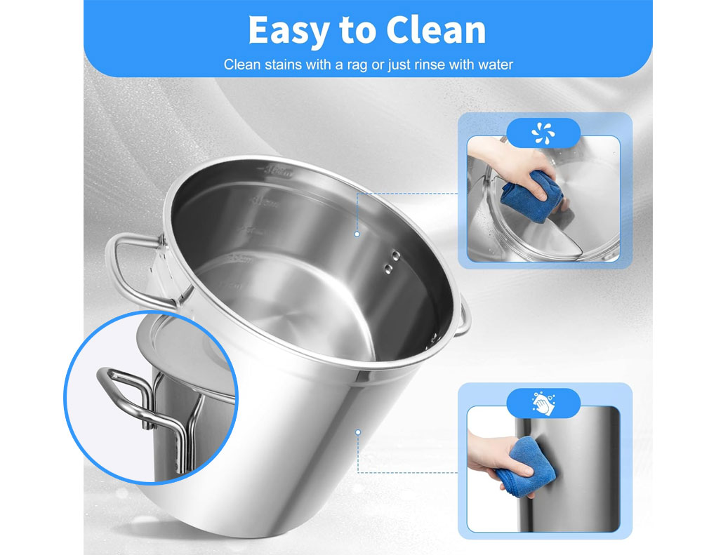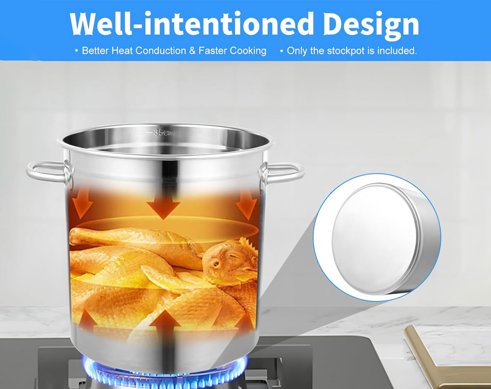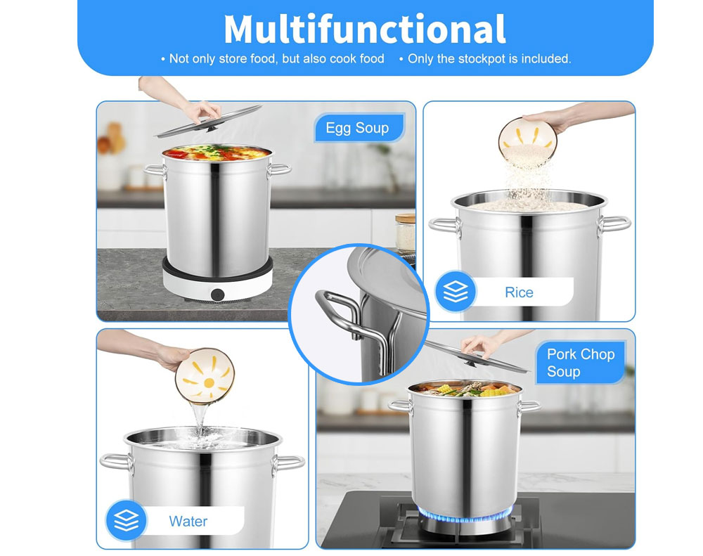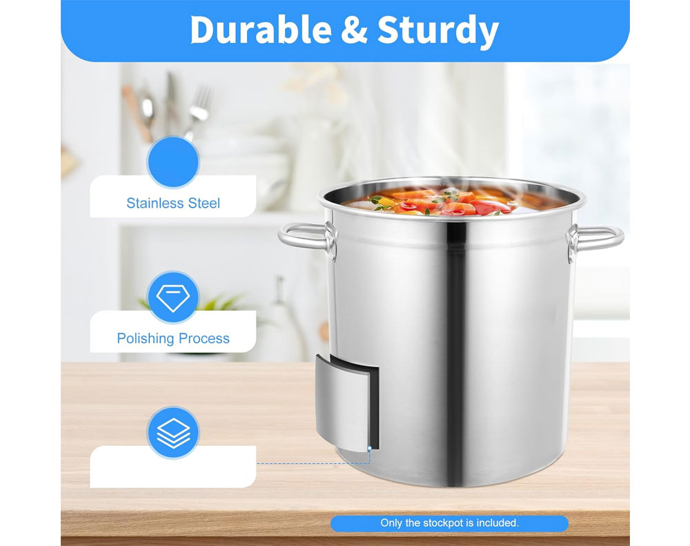 Cook large meals with ease using this heavy duty stainless steel stock pot. Ideal for soups, stews, boiling seafood, and steaming vegetables, it features a durable food-safe build, even heat distribution, and is suitable for all cooktops in home or commercial kitchens