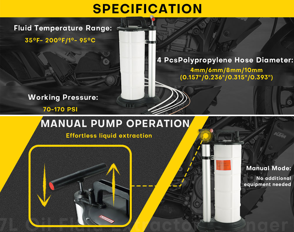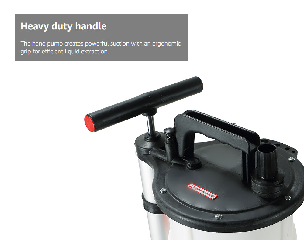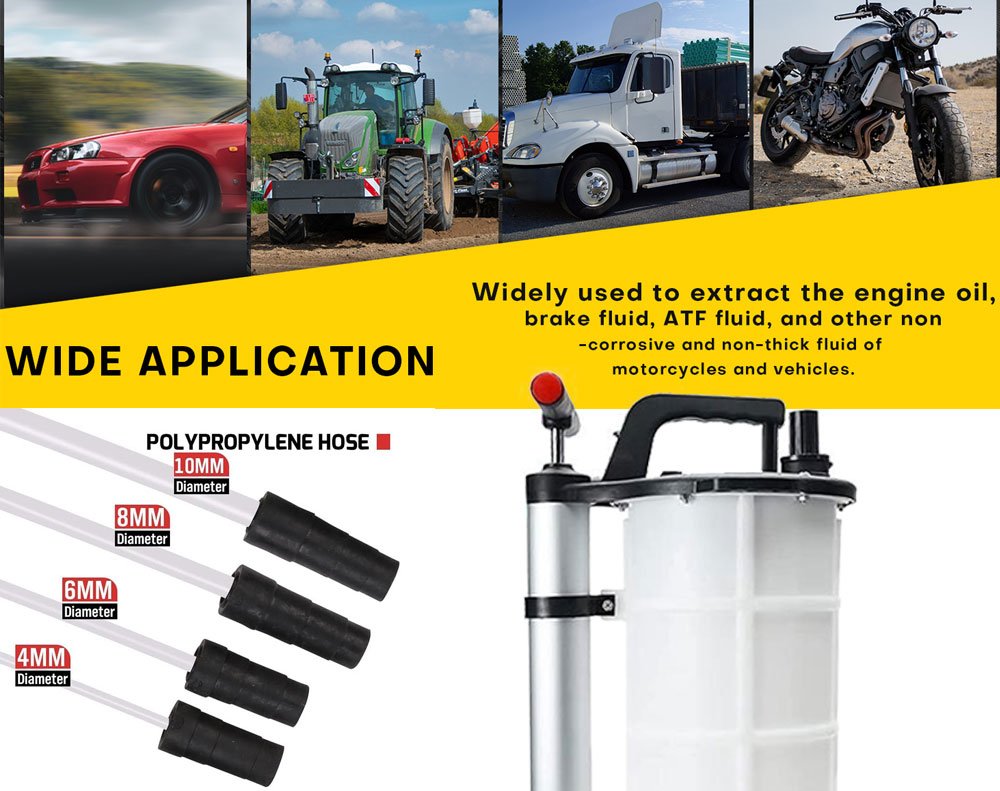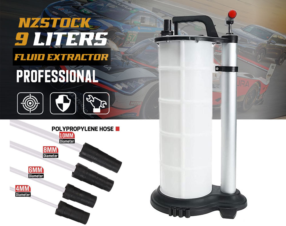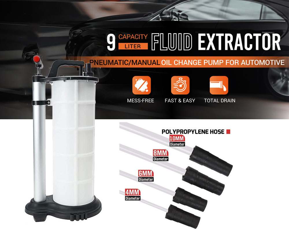 Perform mess-free oil changes without lifting your vehicle! This 9L manual fluid extractor creates powerful vacuum suction to draw out engine oil, brake fluid, and more. Constructed from corrosion-resistant polypropylene, it's durable and features 4 different hose sizes (4-10mm) for complete fluid removal. Ideal for DIY mechanics and professional shops