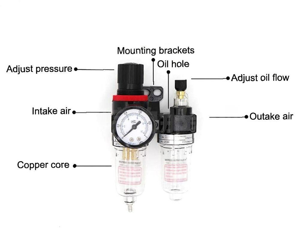 This High-Quality 2-In-1 regulator, water-oil separator, Air Filter Pressure Regulator is equipped with an airflow adjustment knob, which provides you full control of operating air pressure.