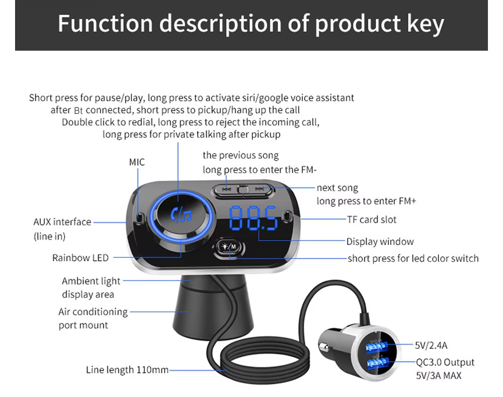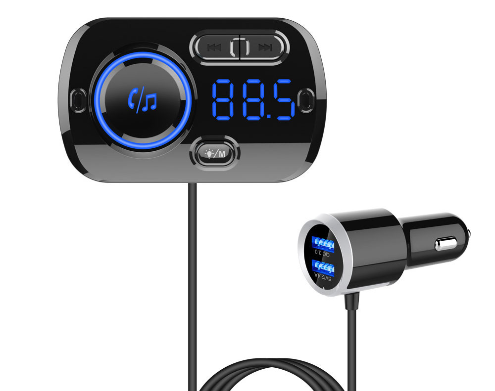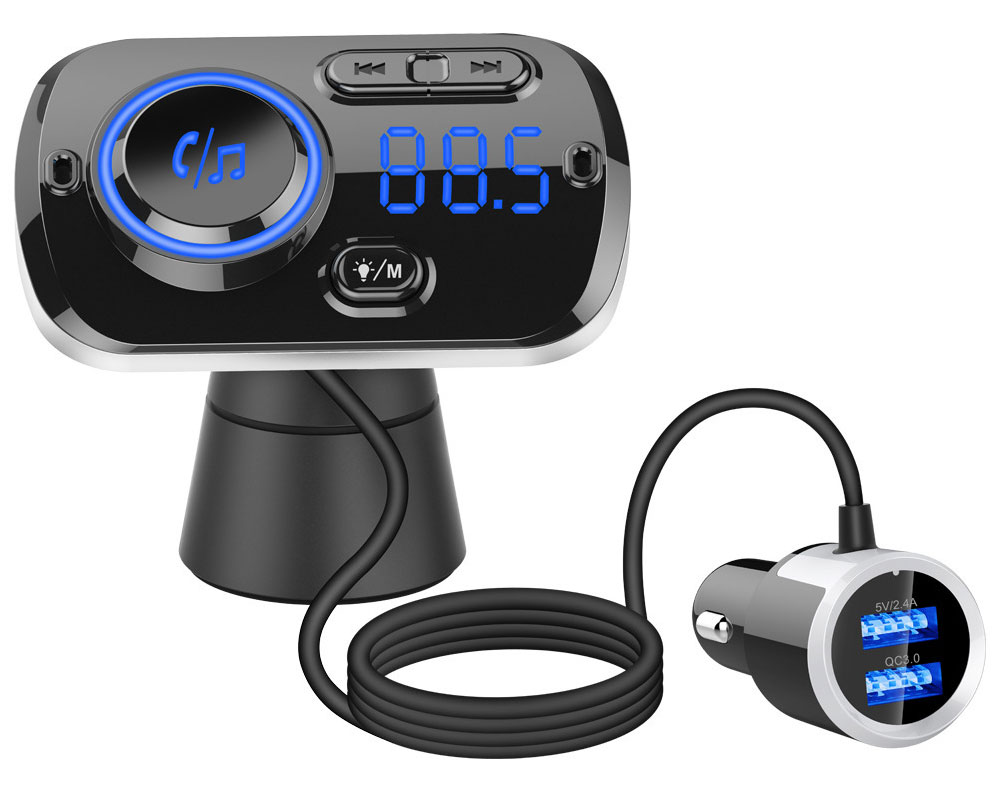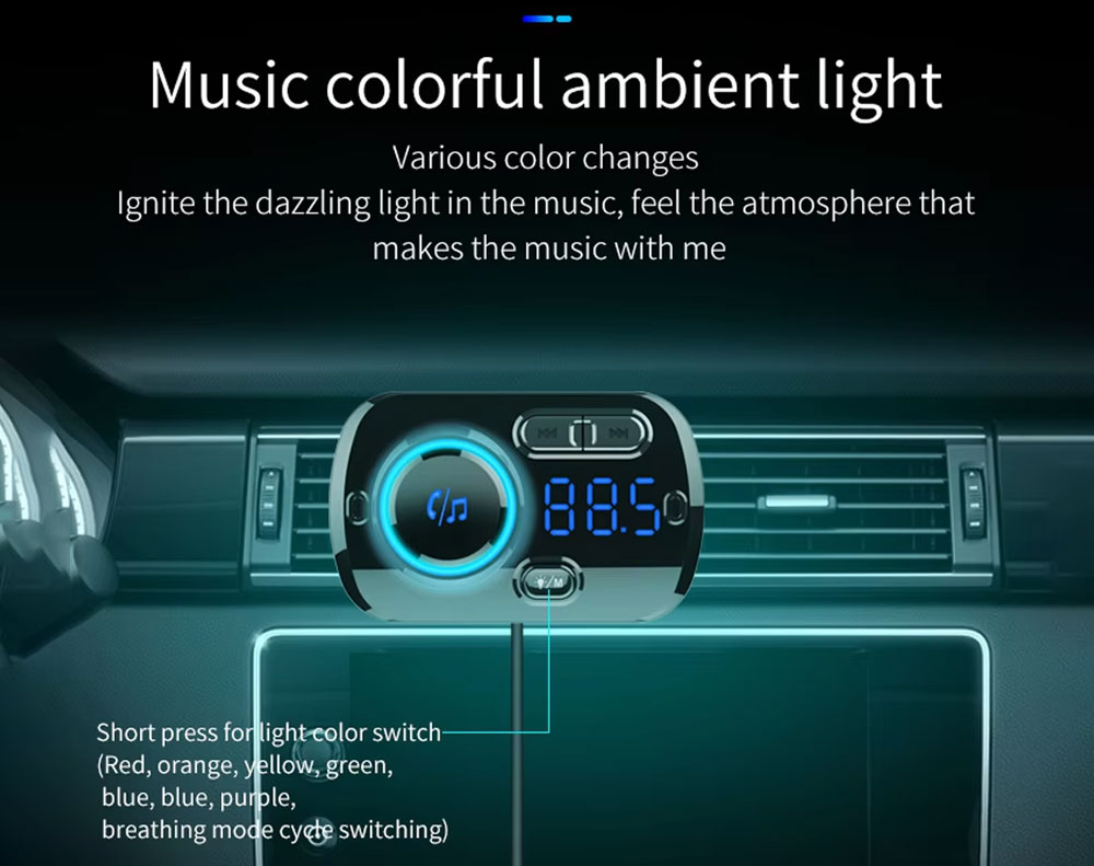 Enjoy music and hands-free calls in your car with this multifunctional FM transmitter. It supports FM full frequency point transmission, Bluetooth stereo music playback, TF card function, and ambient light display. It also features Qualcomm Quick Charge3.0 technology to charge your devices faster and more efficiently.