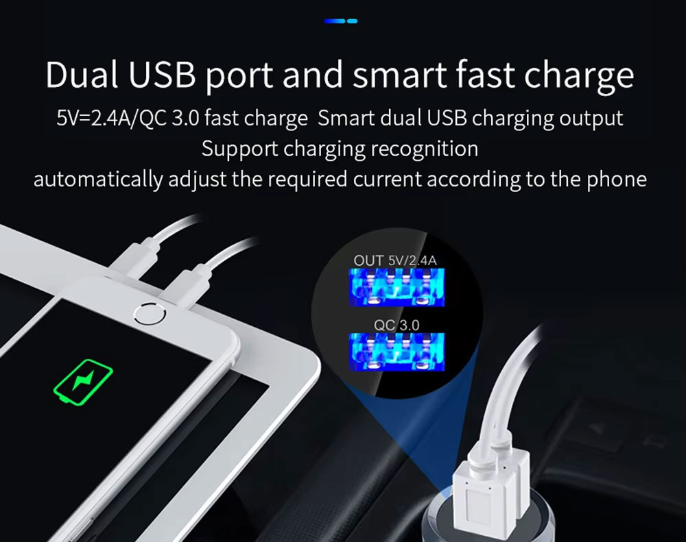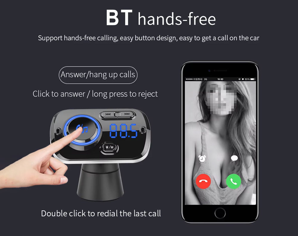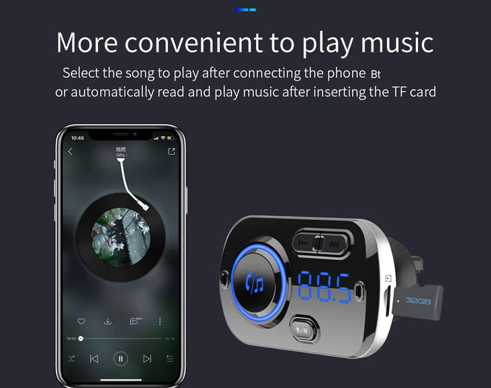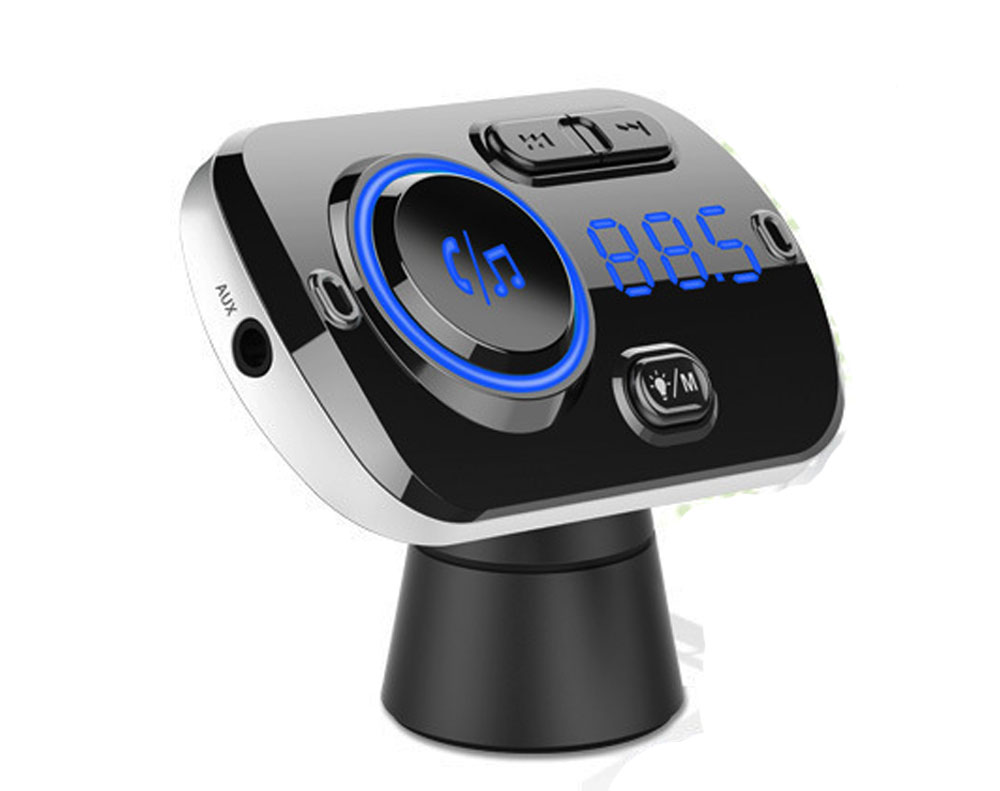 Enjoy music and hands-free calls in your car with this multifunctional FM transmitter. It supports FM full frequency point transmission, Bluetooth stereo music playback, TF card function, and ambient light display. It also features Qualcomm Quick Charge3.0 technology to charge your devices faster and more efficiently.