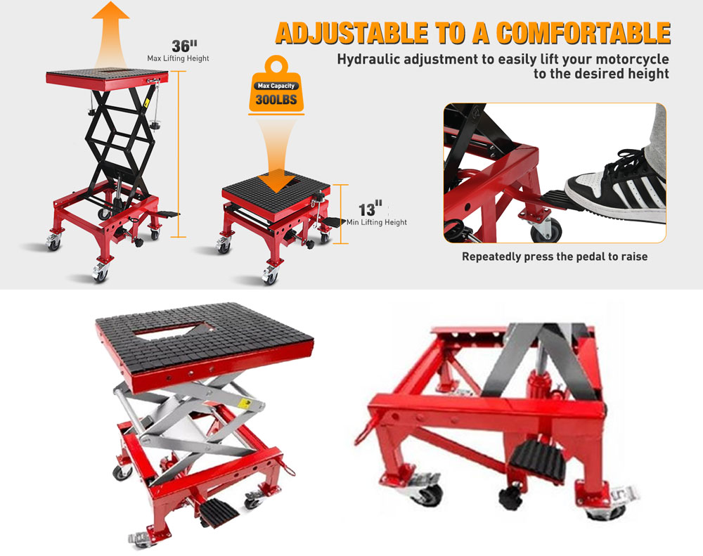 Perform dirt bike and ATV maintenance with ease using this Hydraulic Scissor Jack Lift. Built with high-quality, heavy-duty steel, it securely lifts vehicles up to 300lbs. The wide platform features rubber padding to prevent scratches. It is fully adjustable in height from 13 to 36 inches and includes a foot step for effortless lifting. Comes with all hardware for quick assembly.