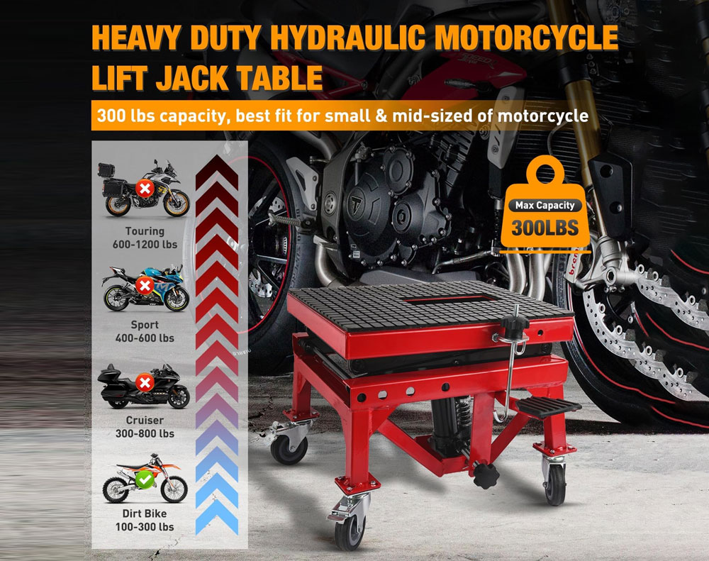 Hydraulic Motorcycle Scissor Jack Lift, Heavy Duty Dirt Bike Jack Stand with 4 Wheels, Portable Lift Table with Foot Step, 300lbs Capacity