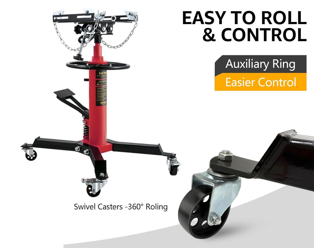 Heavy-duty 3/5 Ton hydraulic transmission jack with 2-stage lift system and 360° swivel wheels for smooth movement. Features adjustable 30° tilt saddle and foot pedal lift for hands-free operation. Ideal for transmission removal, repair, and installation.