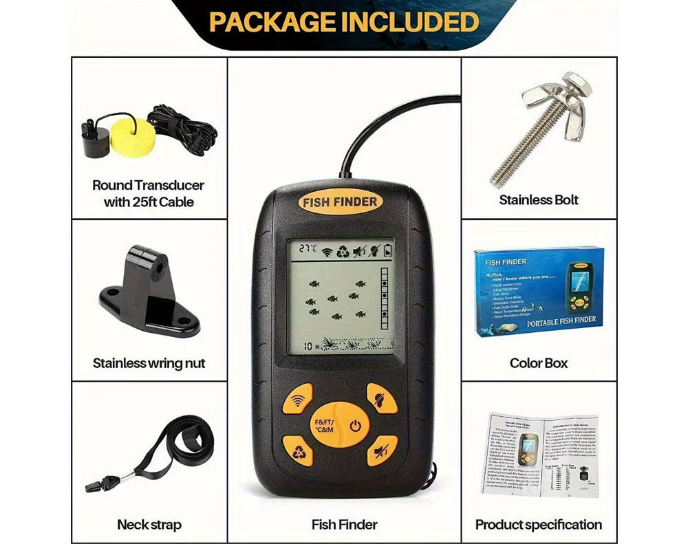 Portable Kayak Fish Finder Sonar with 10m Wired Probe, 100m Max Depth, 45∘ Sensor Angle, LCD Display with LED Backlight, Temperature Display