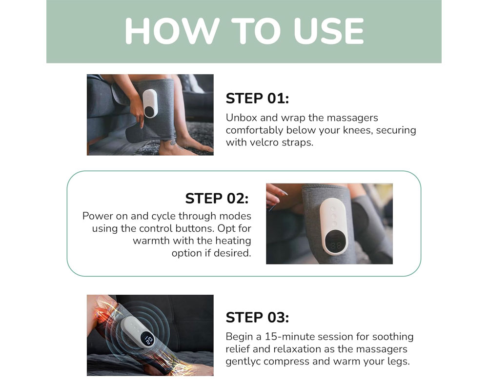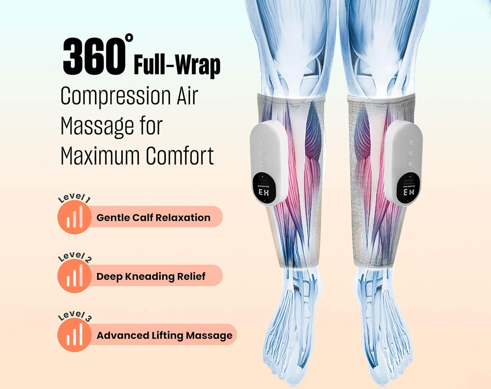 Cordless air compression leg massager with 3 modes and 3 intensity levels for soothing muscle relief. Lightweight, rechargeable, and adjustable with Velcro straps. Built-in 15-minute auto shutoff makes it ideal for home, gym, or travel use