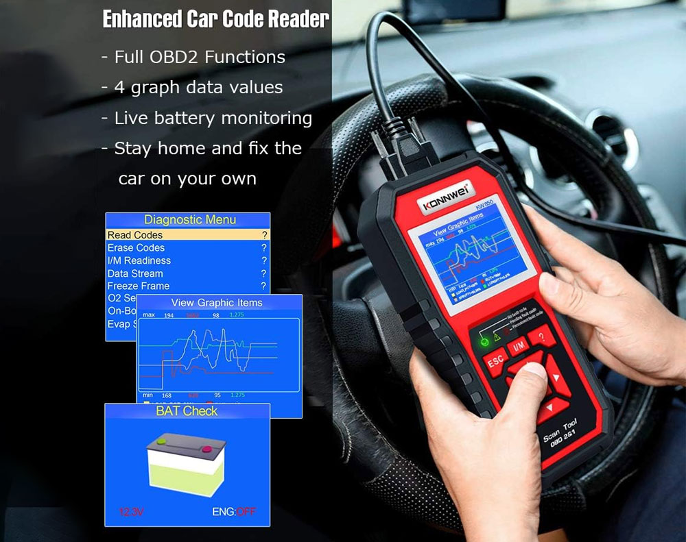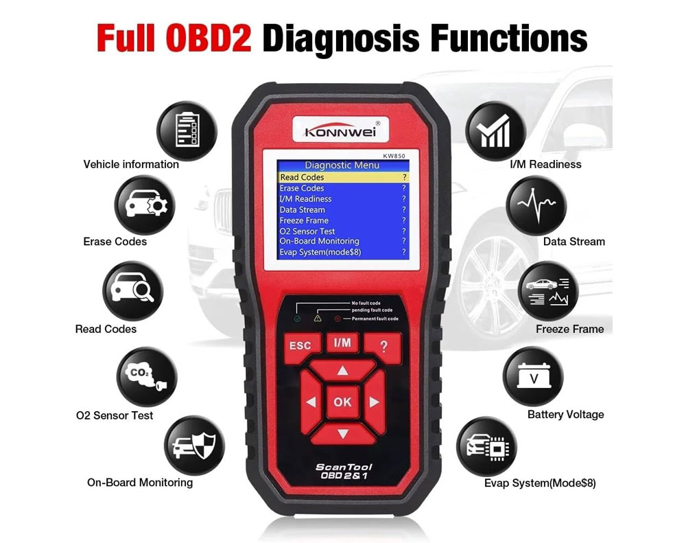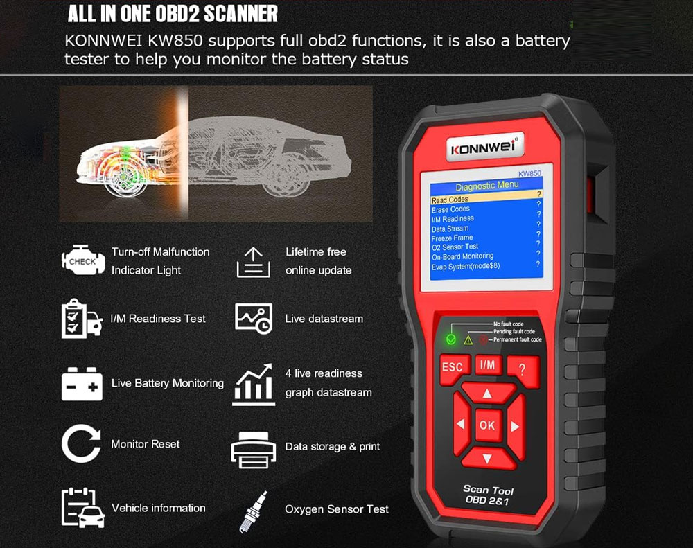* Functions: Read/Erase Codes, I/M Readiness, Data Stream, Freeze Frame, O2 Test, EVAP Test, Vehicle Info, Battery Voltage Test
