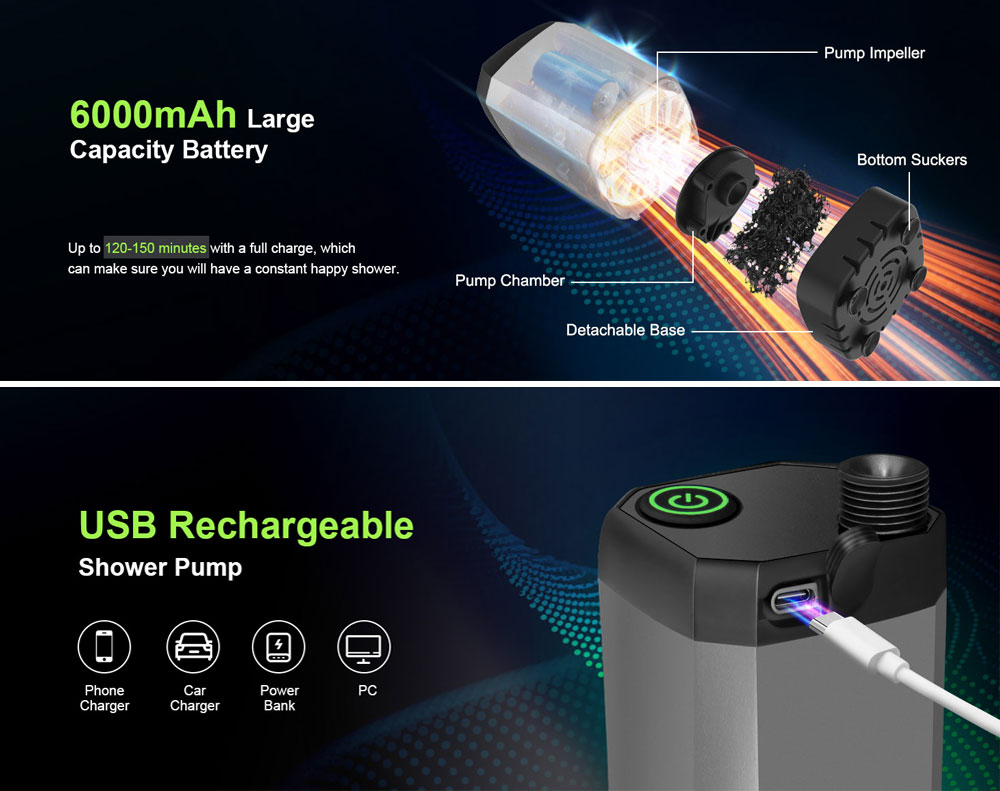 Stay fresh anywhere with this portable camping shower powered by a 6000mAh rechargeable pump. Featuring an LED display, wide water flow, and adjustable shower head, it’s ideal for camping, hiking, pet bathing, gear cleaning, and outdoor travel convenience.