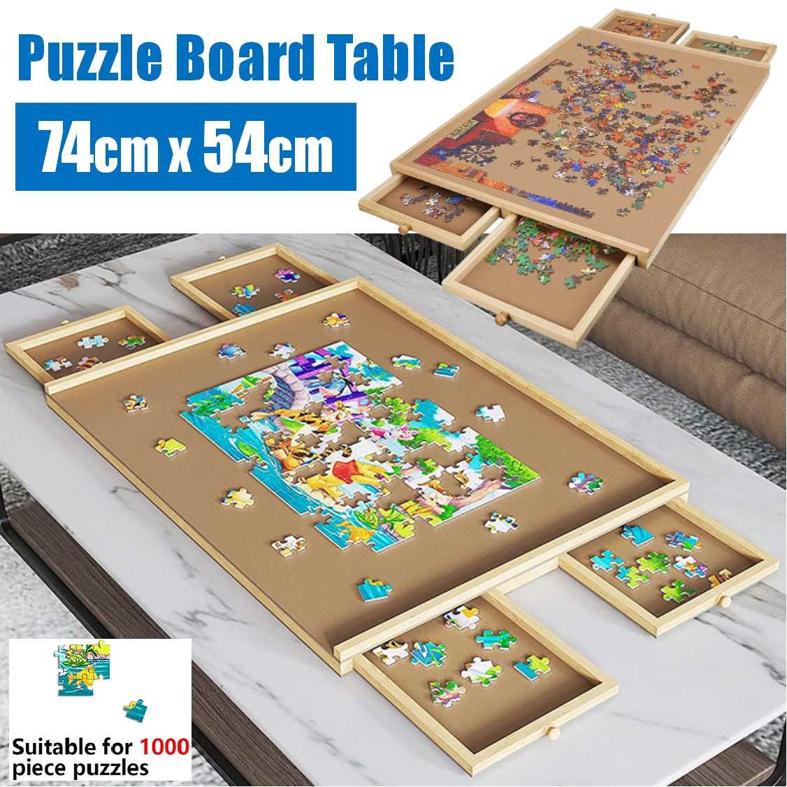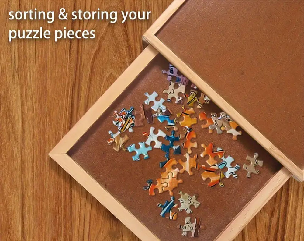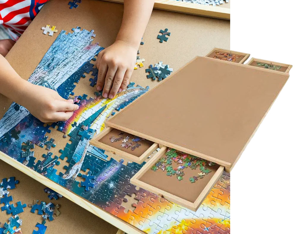 Organize and complete your jigsaw puzzles with ease using our premium wooden puzzle board table. Designed with four convenient storage drawers, you can sort puzzle pieces by color or shape, keeping your workspace tidy and efficient. The smooth surface provides a comfortable puzzle surface, while the raised edges prevent pieces from falling off.