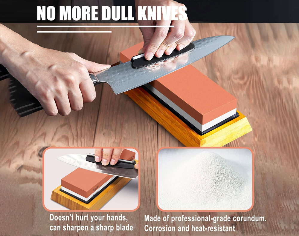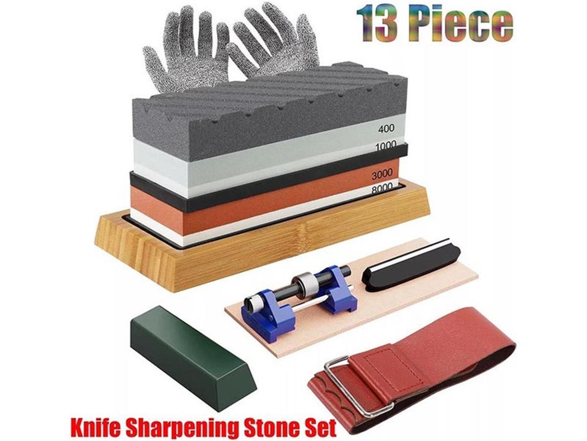 13-Piece Knife Sharpening Stone Set Whetstone 400/1000 3000/8000 Grit with Bamboo Base Angle Guide Leather Strop Gloves Chisel Honing Kit