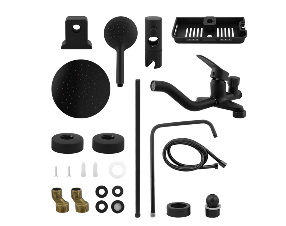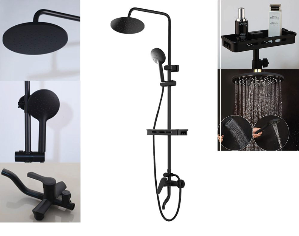 Upgrade your bathroom with this matte black rainfall shower faucet set featuring a powerful rain shower, hand shower, and mixer with tap. Designed for all water pressures, it delivers uniform water flow, water-saving performance, and includes a sturdy storage shelf for daily essentials