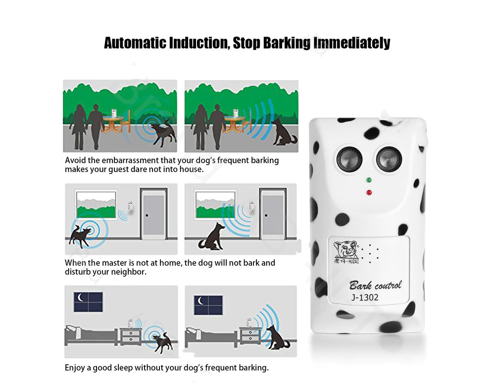 * When the dog barks, the sound arouse electric circuit. Ultrasonic wave will emit from product, it discomforts dog but has no harm to dog